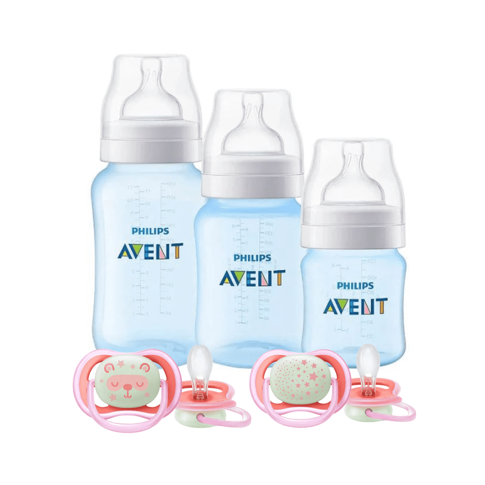 Este set incluye 3 mamaderas anticólicos de 125 ml con tetina de flujo para recién nacido, de 260 ml con tetina de flujo medio y de 330 ml con tetina de flujo rápido