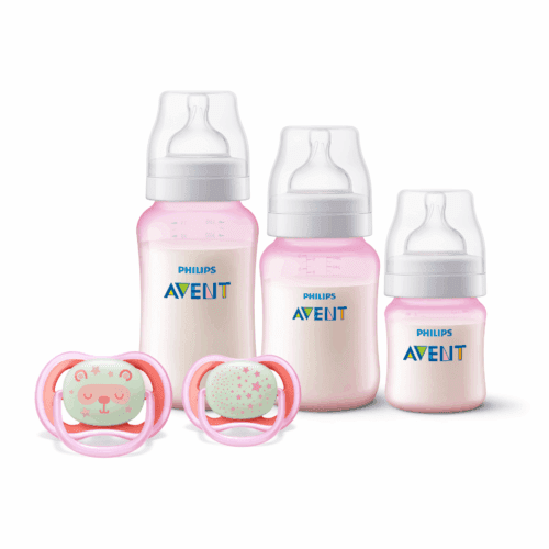 Set 3 Mamaderas Pink + Set de 2 chupetes 6-18 meses Nocturno